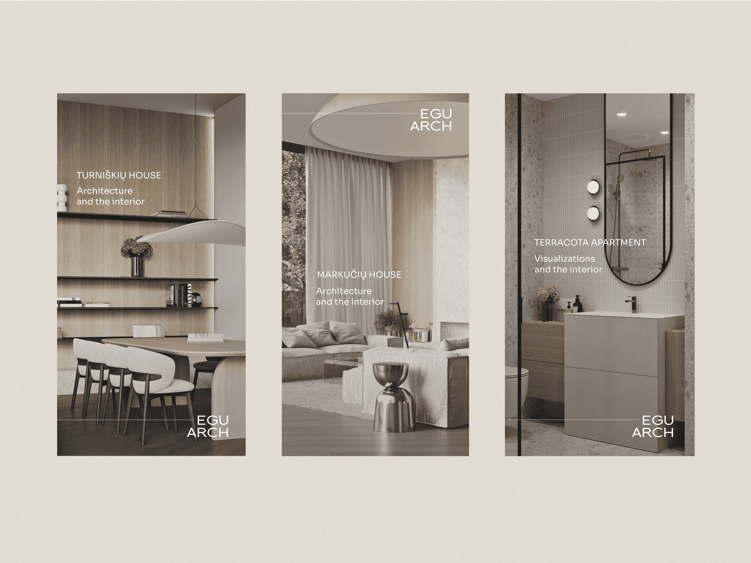Kartu su „Egu Arch“ sukūrėme visapusišką prekės ženklo sistemą nuo pagrindų – nuo logotipo, tipografijos, spalvų paletės iki vizualinių gairių. Šį identitetą perkėlėme į individualiai kurtą svetainę, kurioje dera aiškumas, struktūra ir emocija. Naujoji svetainė aiškiai ir profesonaliai pristato studijos darbus, tuo pačiu padėdama siekti verslo tikslų ir stiprindama kūrybinį identitetą.