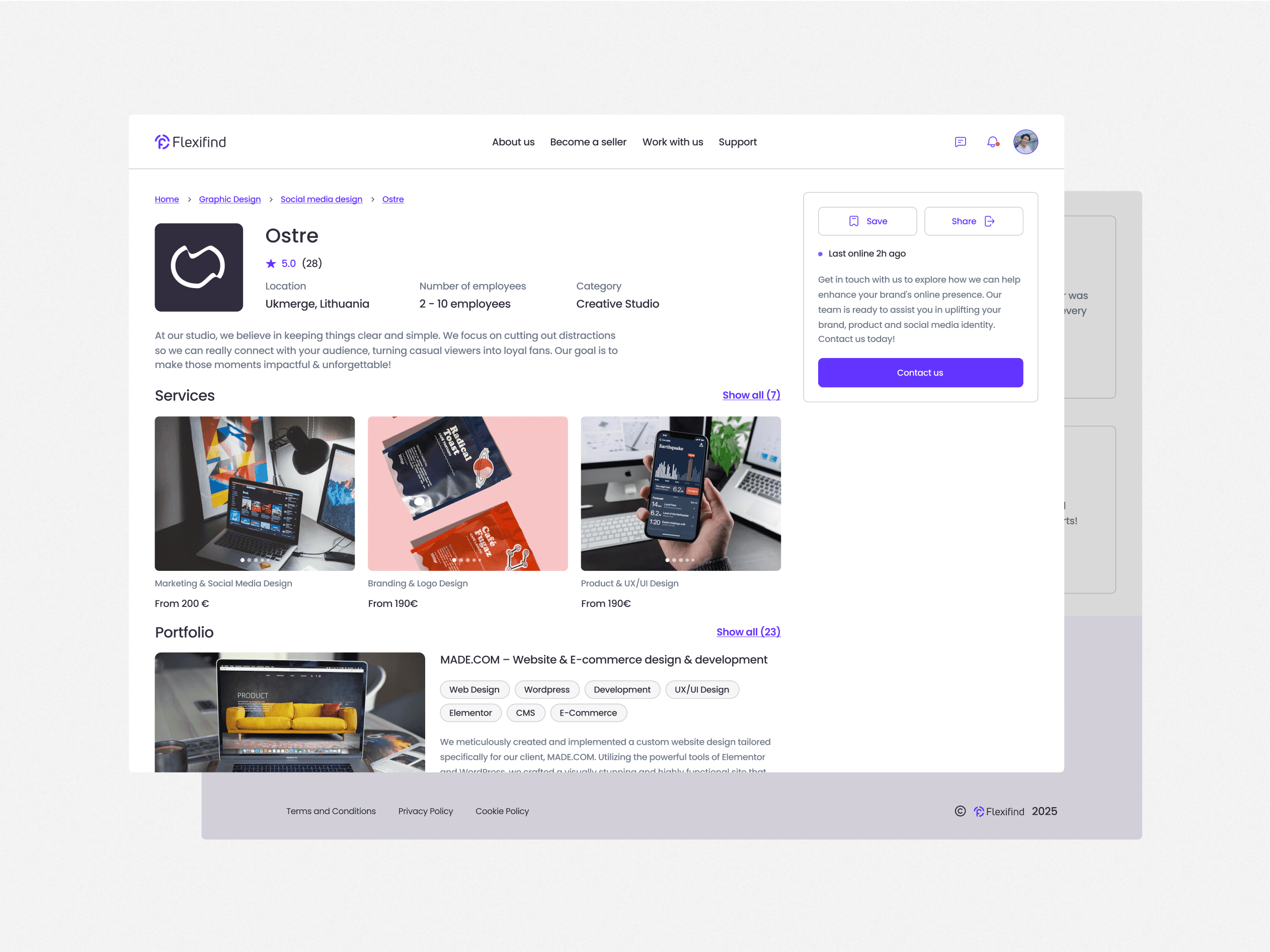 Sukūrėme tiek šviesų, tiek tamsų dizaino režimus, kad platforma būtų patogi naudoti įvairiose situacijose – tiek kompiuteriuose, tiek mobiliuosiuose įrenginiuose. Išlaikėme vizualinį nuoseklumą ir prieinamumą visiems naudotojams. Turint tvirtą pagrindą, „FlexiFind“ dabar pasiruošusi pasitikti naujus vartotojus ir pristatyti produktą, atliepiantį besikeičiančius laisvai samdomų specialistų poreikius.