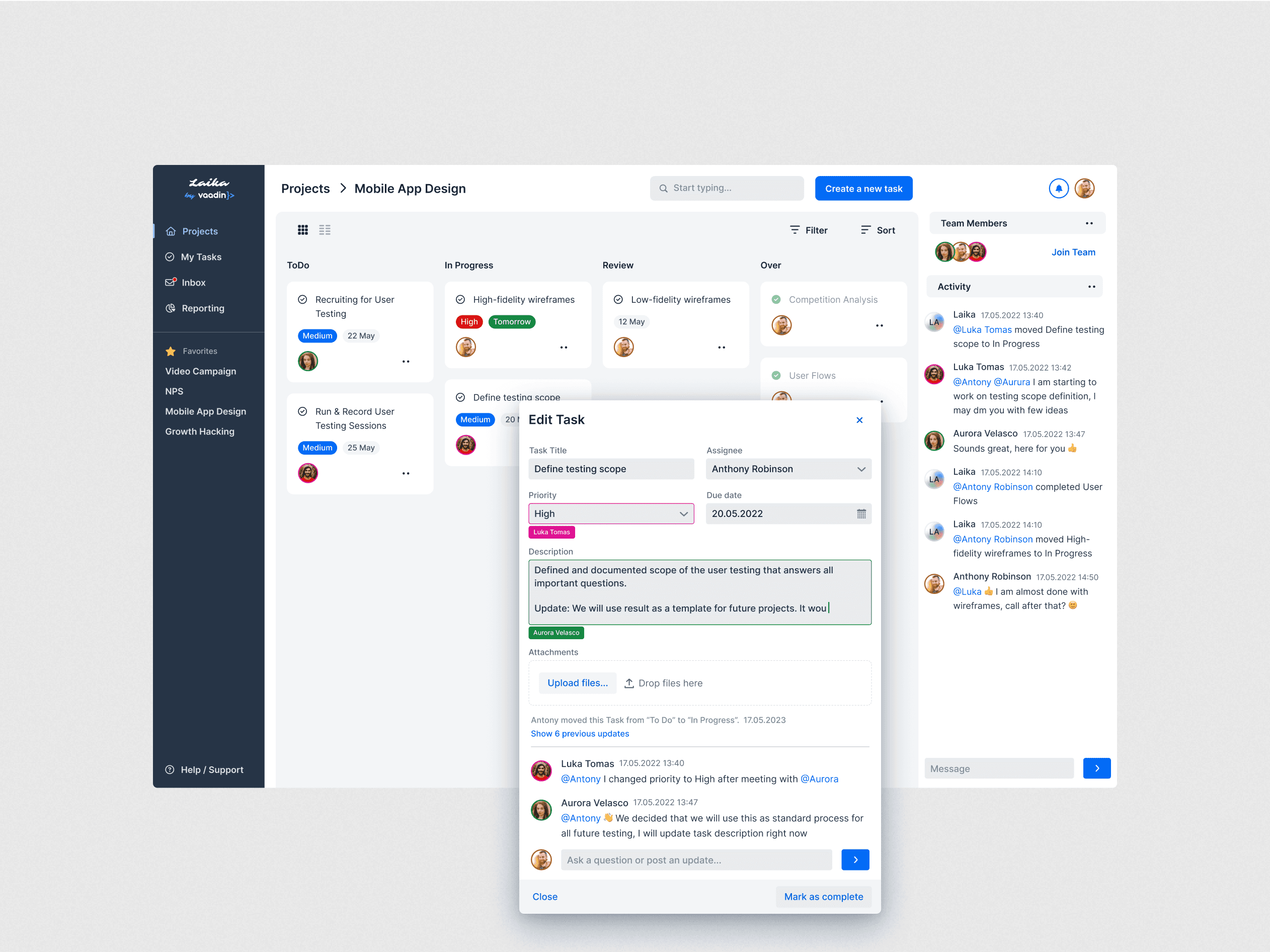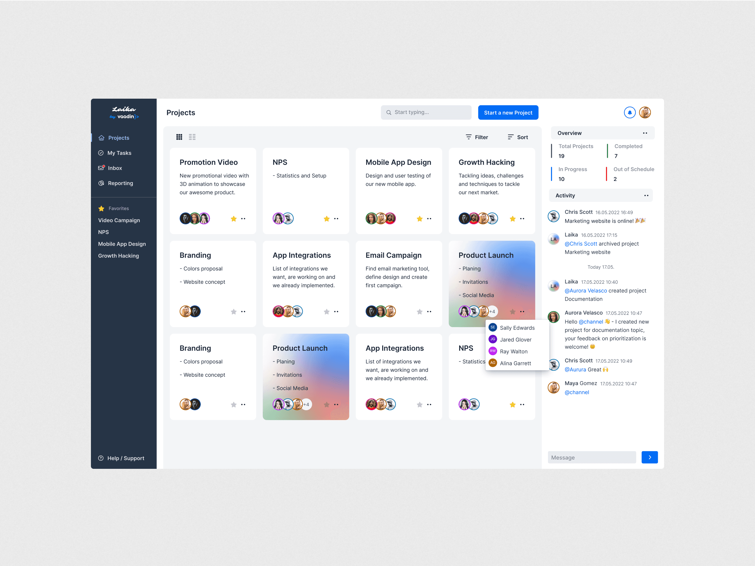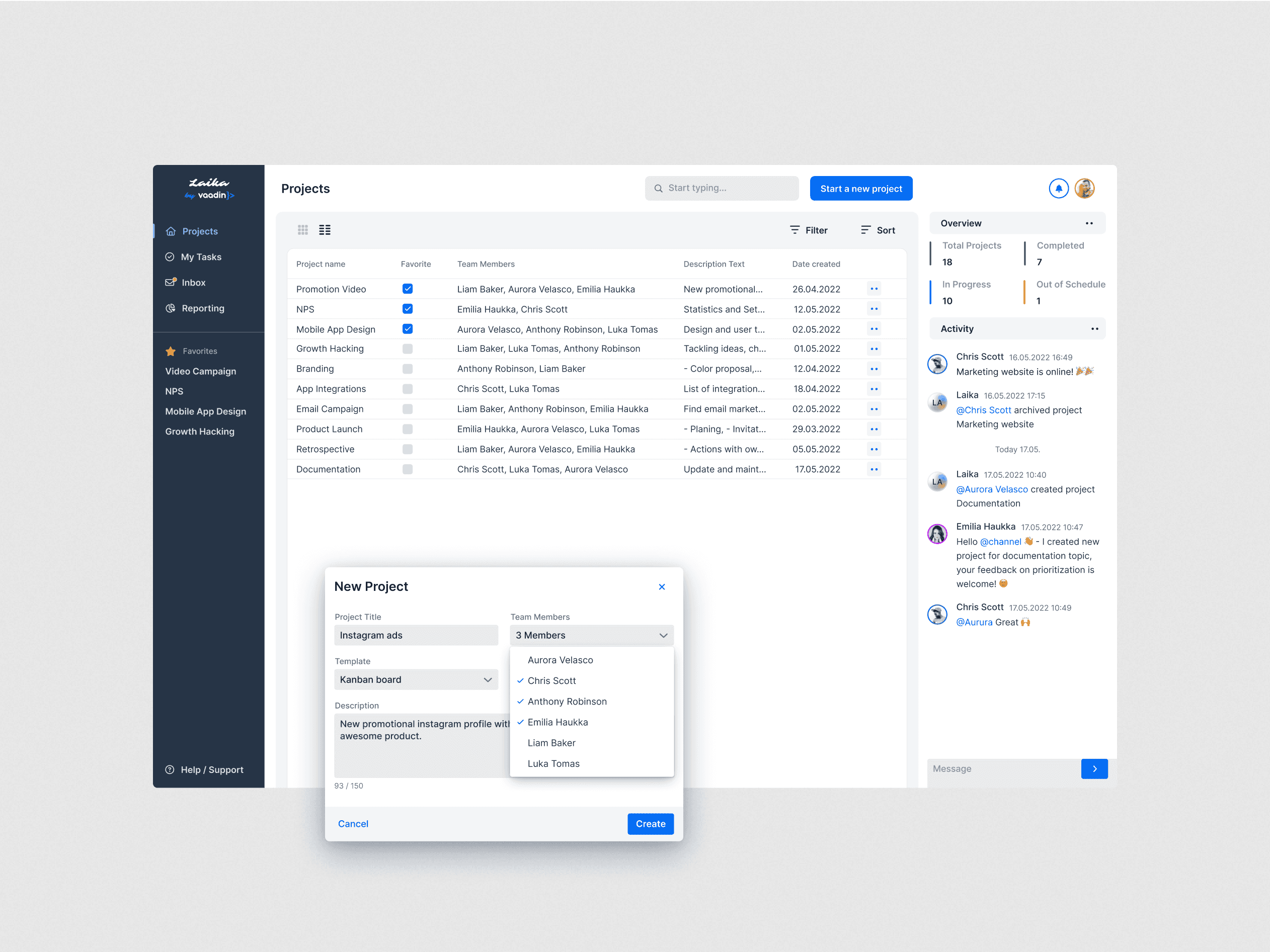 „Laika“ – tai bendradarbiavimui skirta organizacijų projektų valdymo platforma, sukurta „Ostre“ kaip koncepcinis darbas „Vaadin Design“ konkurse. Šio projekto tikslas buvo sukurti šiuolaikišką, lengvai valdomą ir išmanų įrankį, kuris supaprastintų komandos koordinavimą, projektų stebėjimą ir darbą tiesioginiulaiku – visa tai paremta „Vaadin Collaboration Kit“ pagrindu. Dėmesys naudotojo patirčiai, sistemos aiškumui ir išmaniam automatizavimui atskleidžia, kaip dizainas gali tapti produktyvumo varikliu verslo įrankiuose.